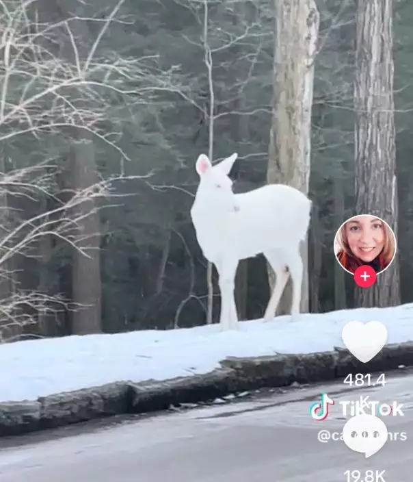 女子回家途中偶遇罕見「白化鹿」