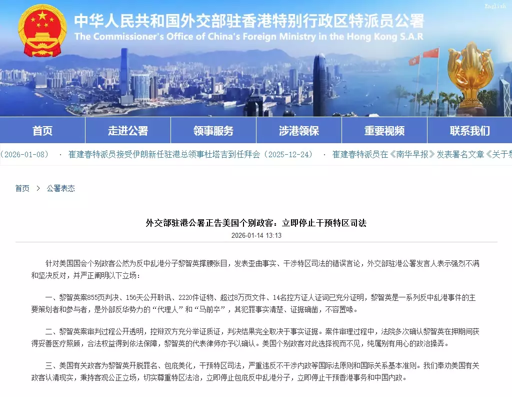外交部駐港公署對美國國會個別政客,公然為反中亂港分子黎智英撐腰張目,發表歪曲事實、干涉特區司法的錯誤言論,表示強烈不滿和堅決反對,奉勸美國有關政客認清現實,秉持客觀公正立場,切實尊重特區法治,立即停止包庇反中亂港分子,立即停止干預香港事務和中國內政。