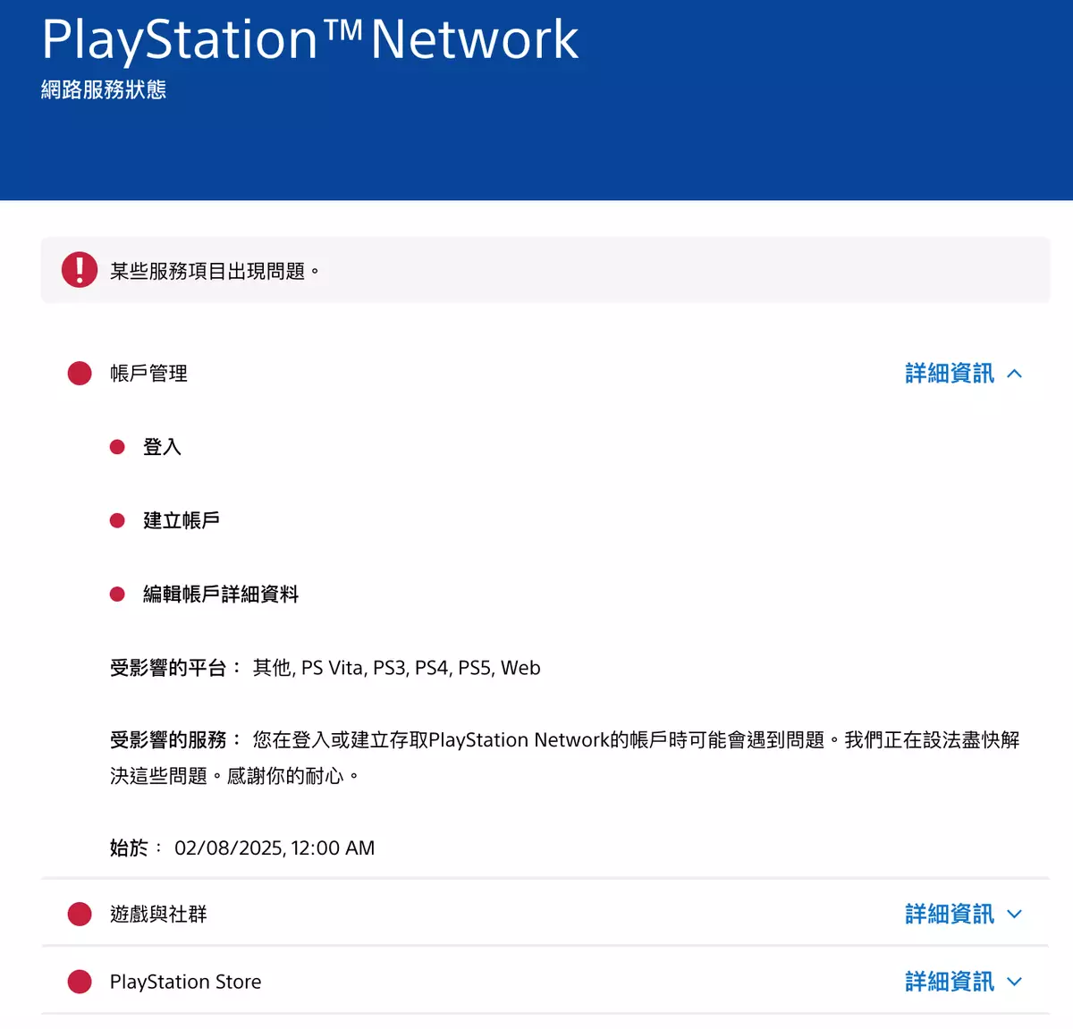 大死機在香港時間8日早上開始。美聯社報道,PlayStation在其社交媒體平台上表示:「我們知道有用戶目前可能遇到 PSN 問題」,受影響主機包括PS Vita, PS3, PS4和PS5。有關連線死機問題在社交媒體上迅速傳播,不少用戶因登入失敗無法玩遊戲而感到沮喪。