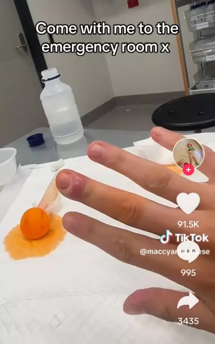 到了醫院後,急診室醫護人員隨即使用專業醫療器材將傷口切開,並將膿液擠出。阿莫伊斯描述,「醫生打開傷口時,膿液立刻流出。他還說味道非常臭,因為感染已經超過1週。」她回憶道,醫生當時擠出了整整2毫升的膿液。