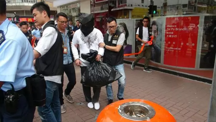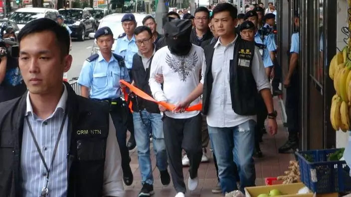 疑犯被黑布蒙頭及鎖上手扣