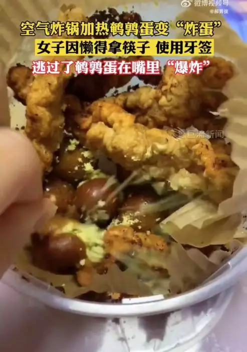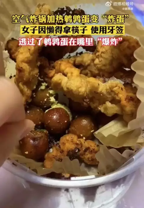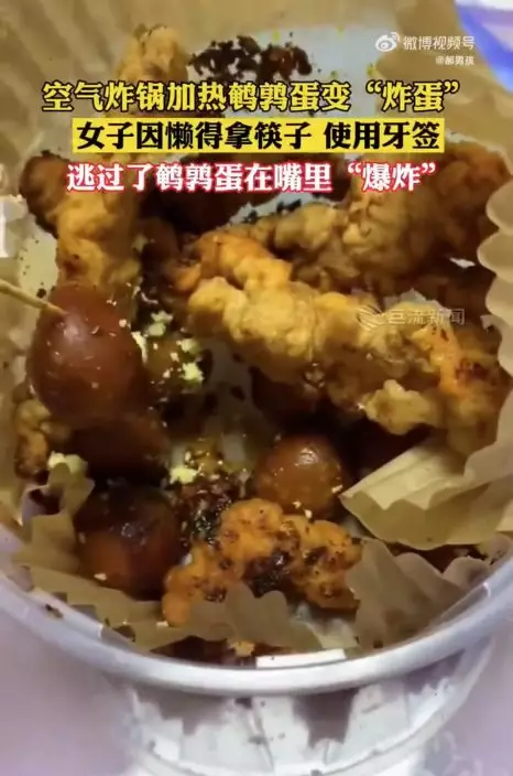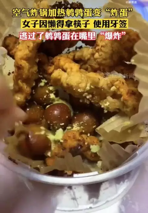 內地一名女子用空氣炸鍋加熱鵪鶉蛋,隨後用竹籤戳竟瞬間爆開成「炸蛋」,驚險畫面曝光!