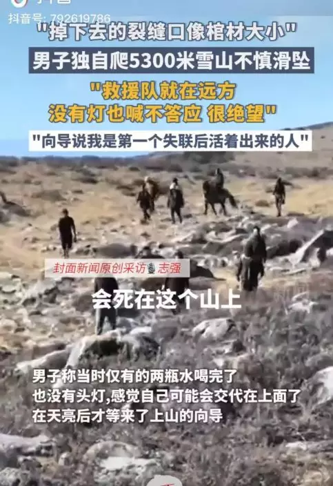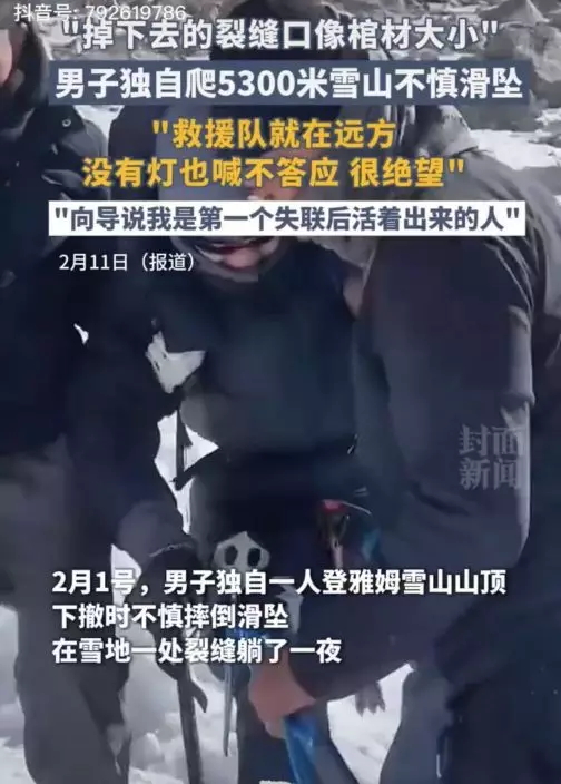 內地登山客獨自挑戰海拔5300米雅姆雪山,結果意外被困在雪地裂縫中強撐一晚,幸好翌日奇蹟獲救。