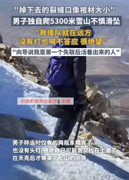 男子之後在雪地一處如「棺材板」的裂縫中躺了一夜,當時外面的風力大約有10級左右,他不敢睡覺,只能強迫自己運動保持體溫,直至堅持到天亮才得以被救援隊發現。