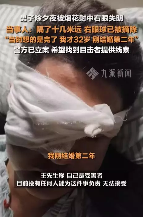 綜合內媒報導,安徽淮南一名32歲王姓男子於1月28日晚間和妻子在當地八公山記憶廣場觀看煙花爆竹時,不幸被炸傷右眼,導致右眼球最終被摘除,「我們是站在距離燃放點大約10米的位置,當晚8時50分左右,有人燃放煙花爆竹,我的眼睛突然一黑,右眼看不到東西,鮮血直流」。