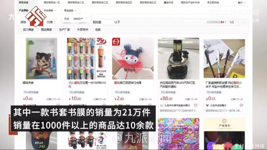日前在義烏國際商貿城的市場,不少商鋪都出售哪吒相關的小商品。在義烏國際商貿城官網搜索發現,一些印有哪吒形象的書套、本子、玩具小車、鑰匙扣等商品正在熱售,而這些商品上的logo和印花大多為6年前《哪吒1》時的IP形象。