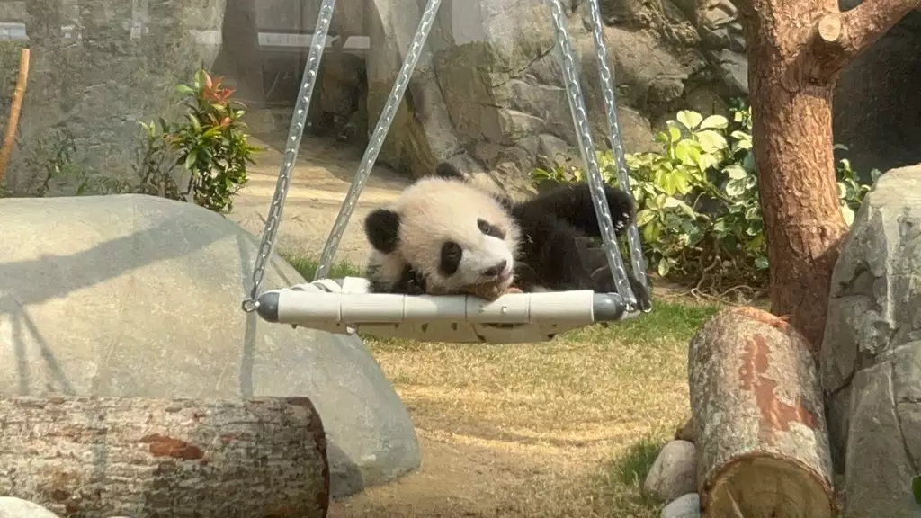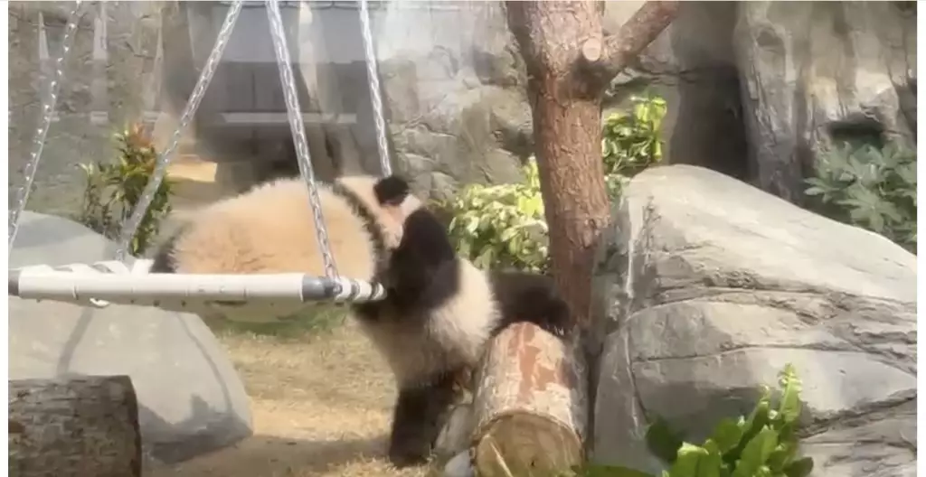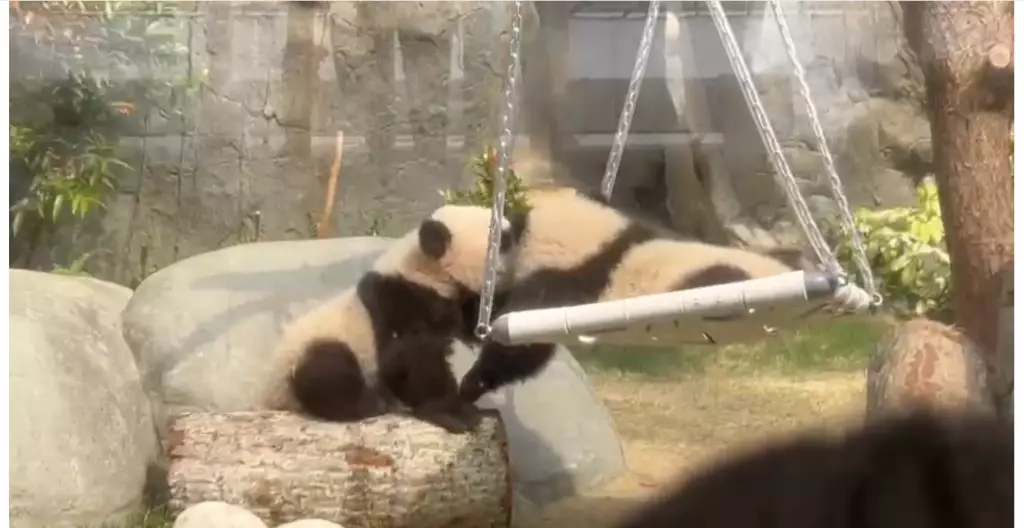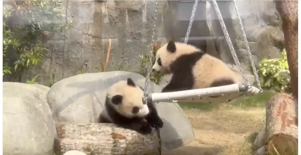 護理員先後抱出「整袋米」咁重的一對龍鳳胎到展覽室,室內放有鞦韆、滑梯等。家姐一出場就表現得輕鬆自由,又瀡滑梯又爬樹,但細佬就有點「扭計」 ,想爬樹但又不成功,多次嘗試手腳並用怕上樹,但屢試屢敗,最後直接在眾目睽睽之下整個熊連滾帶爬跌落地,略顯尷尬的細佬「係邊度跌低,就係邊度迅速爬走」,狼狽離場,臨走一刻還扮做若無其事推了推鞦韆,然後迅速消失在傳媒的鏡頭前。