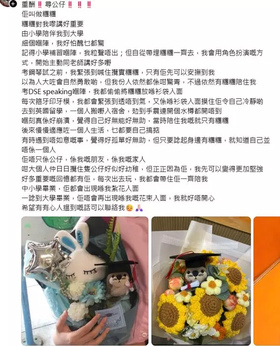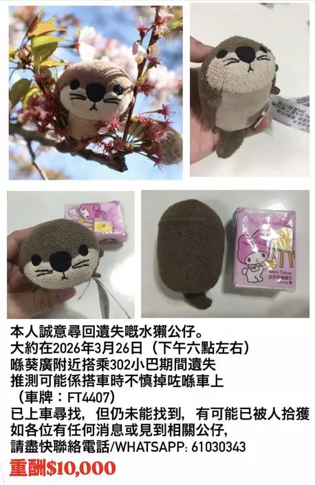 一名19歲女大學生上月遺失陪伴她長達10年的心愛水獺公仔「糰糰」,心急如焚的她懸賞1萬元尋回。其兄長不忍妹妹終日以淚洗面,決定私人加碼2萬元,將總酬金提高至3萬元,希望能在葵涌一帶尋回這個對妹妹而言如同家人的玩偶。