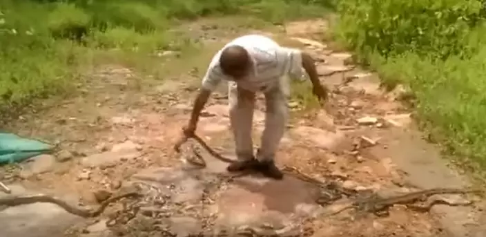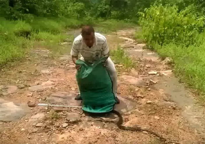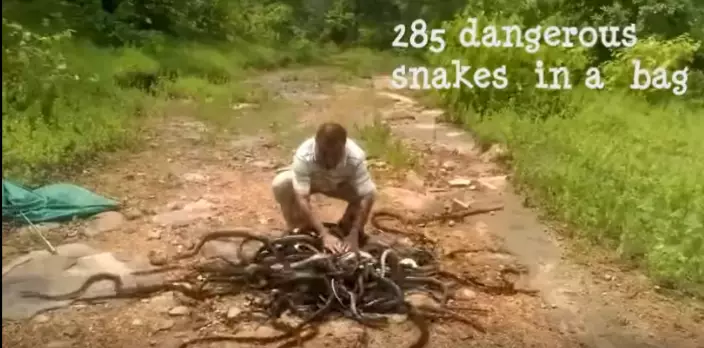 一名印度早前在博帕爾森林一處空地,雙手提起一個綠色的布袋,瞬間釋放285條蛇。大量蛇迅速向四面八方逃走,其中一條蛇不慎纏在公園管理人的足踝上,他卻淡定直接用手拿起牠,並把牠放走。