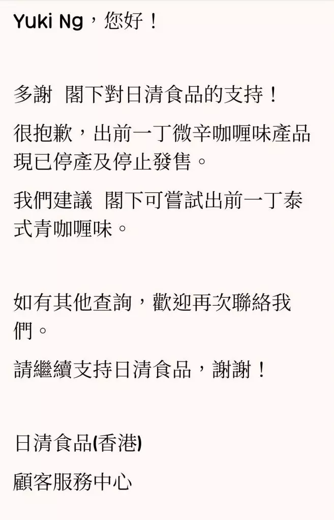 該網友就在Facebook群組「香港即食麵/杯麵分享群組」公開一封日清食品(香港)顧客服務中心的回信,信中寫到「很抱歉,出前一丁微辛咖喱味產品現已停產及停止發售,我們建議閣下可嘗試出前一丁泰式青咖喱味 。請繼續支持日清食品,謝謝 !」