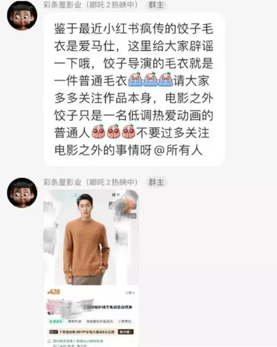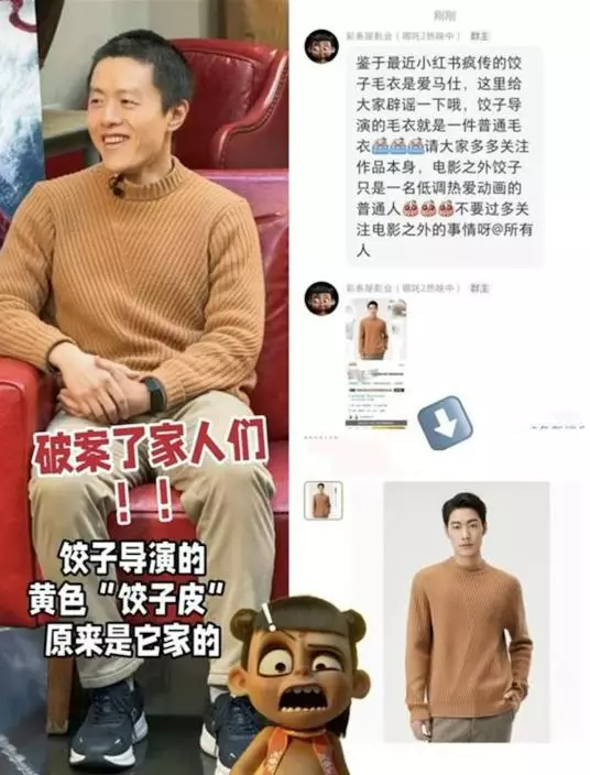 針對這一話題,《哪咤之魔童鬧海》的出品方彩條屋影業在社交平台上回應,澄清餃子導演的毛衣並非網上流傳的高端品牌,而是一件普通毛衣。