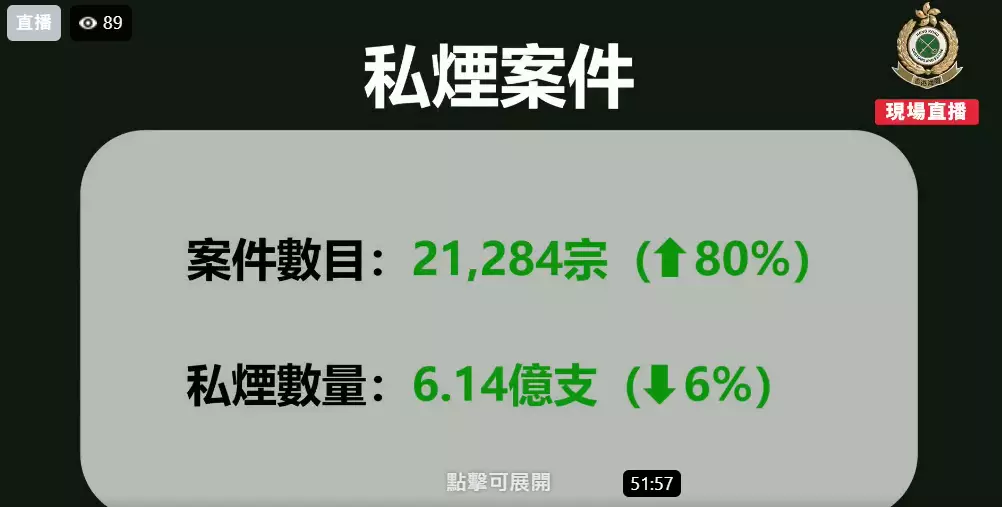 在私煙案件方面,去年有21000多宗,按年上升八成,私煙數量超過6億支,下跌6%。