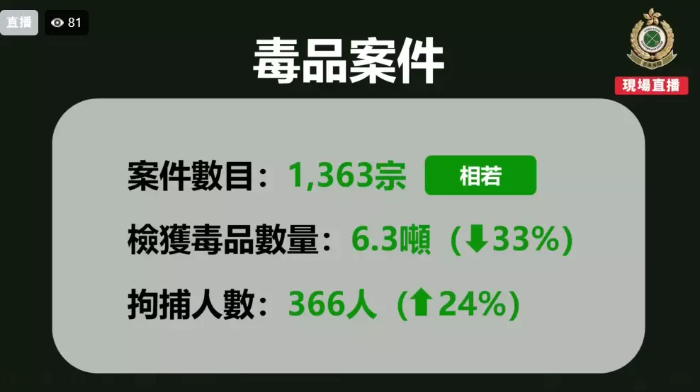 去年毒品案件有1363宗,與前年相若,檢獲毒品數量6.3噸,跌幅三成三,拘捕366人,增加24%。當中涉及太空油毒品的案件19宗,檢獲23.5公斤太空油毒品。