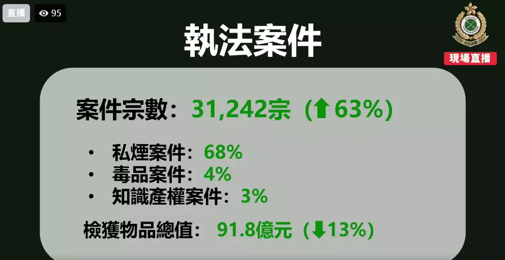 海關去年進行執法行動,處理31000多宗案件,比前年增加63%,當中的私煙案佔最多,有68%;其次是毒品案,佔4%。