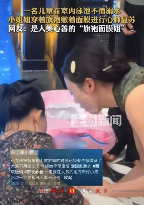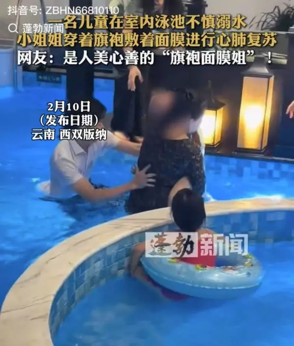 內地一名女子入住酒店見到有女童溺水臉色發紫,身穿旗袍還臉上還敷著面膜的她毫不猶豫地為對方進行急救,最終成功挽回一命獲網友封為「面膜女俠」。