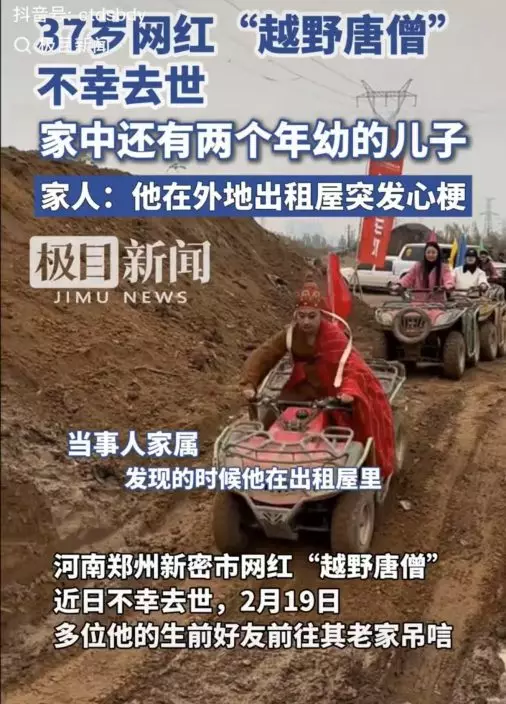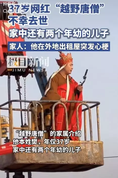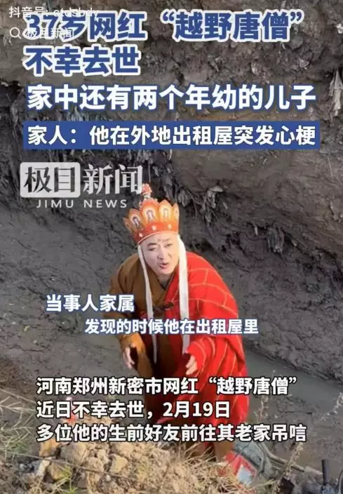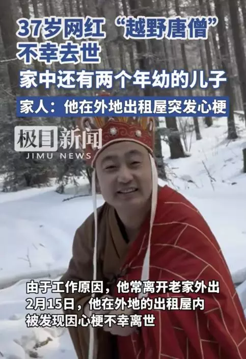 綜合內媒報導,河南一名以模仿《西遊記》中唐僧造型拍攝搞笑視頻爆紅的網紅「越野唐僧」2月15日被發現在外地出租的套房內,因心肌梗塞不幸去世,終年37歲,留下2名年幼兒子。