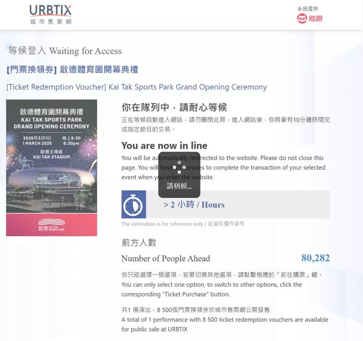 本網記者準時10點登入城市售票網有關啟德體育園開幕禮的門票換領券售賣網頁,網頁已顯示前面逾8萬人正排隊中,呼籲耐心等候,並預計排隊時間多於2小時。