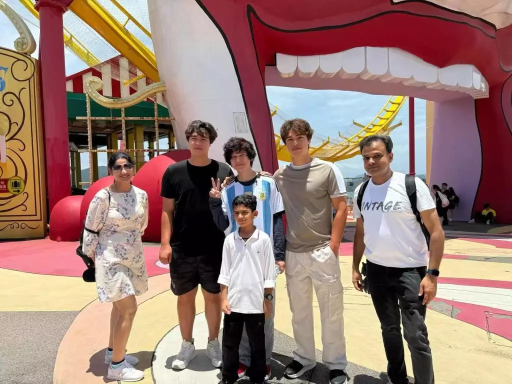 有網民影到混血肥仔背著太太芊蕙子及兩個女兒,與其頻道拍檔丁丁(丁彥均)撐枱腳。