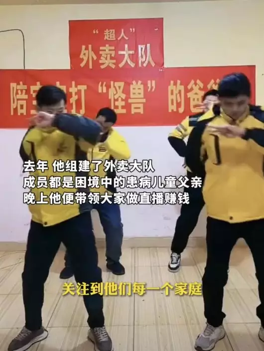 去年,張軍還組織成立了一個「外賣大隊」,隊員多為患病兒童爸爸。晚上,他則帶領大家通過直播賺取收入,幫助減輕經濟壓力。