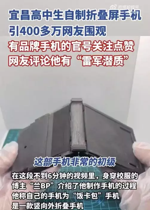 綜合內媒報導,湖北宜昌一名高中生於1年前利用存下的零花錢購買了一台3D列印機。鑑於市面上只有內折疊式手機,還沒有外折疊式智能手機,於是便萌生了製作「外折疊式智能手機」的念頭。
