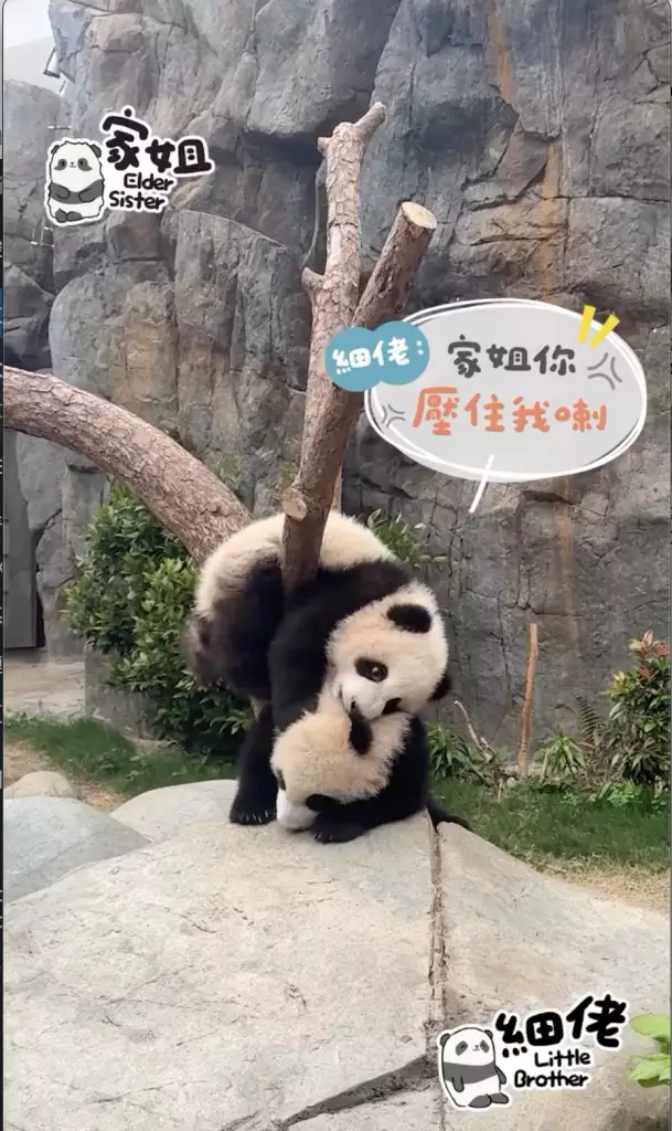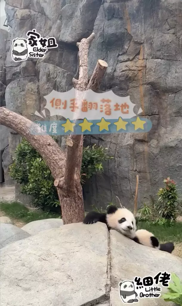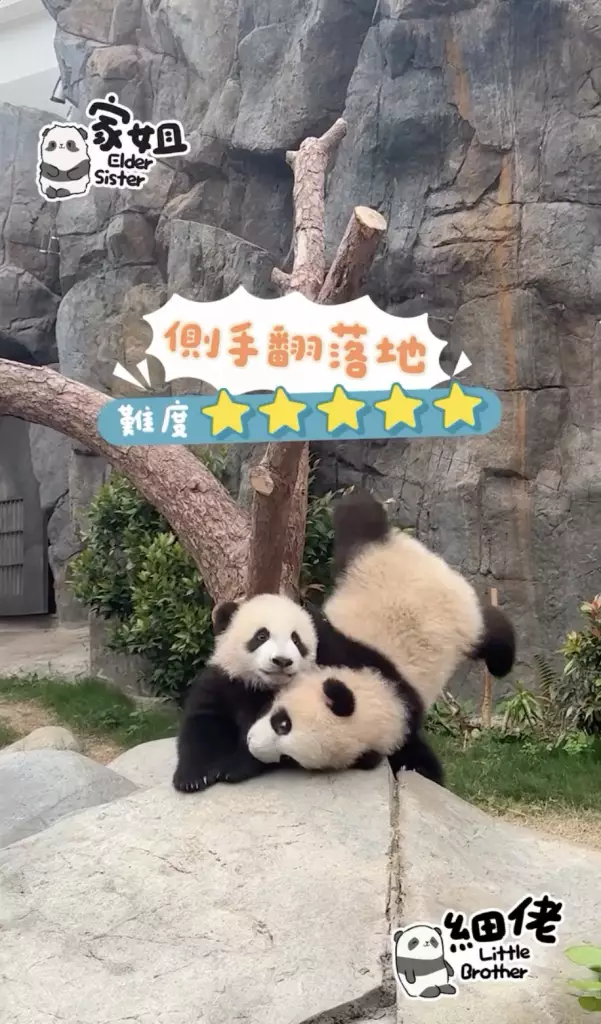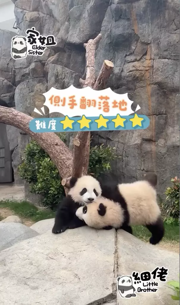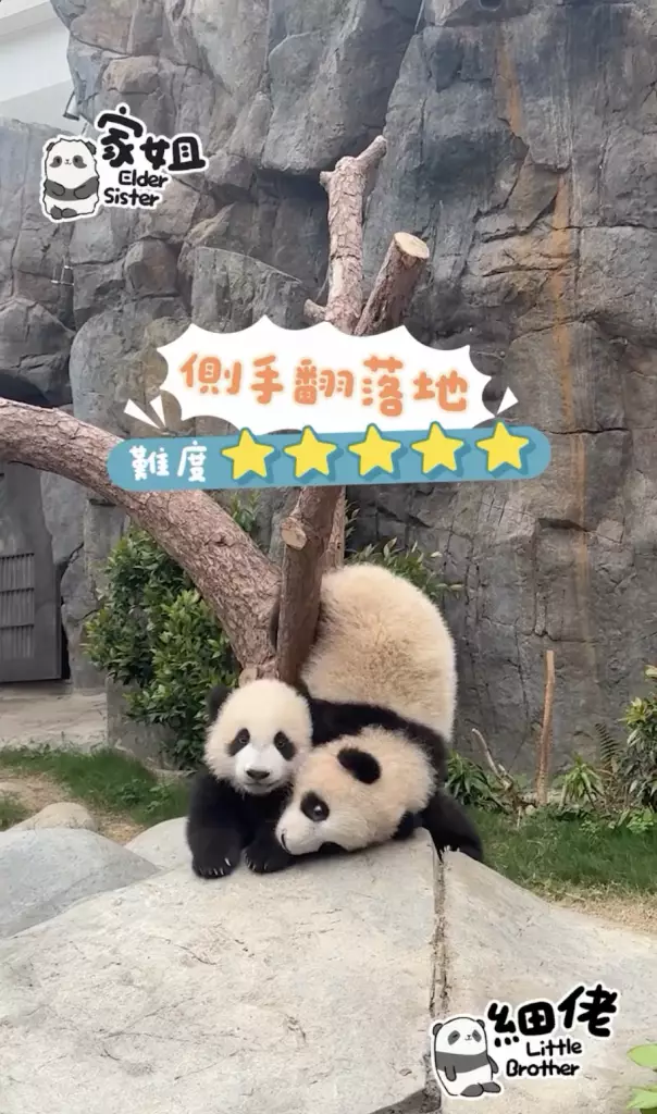 海洋公園大熊貓「盈盈」所誕下的一對龍鳳胎「家姐細佬」一向鬼馬精靈,早前海洋公園就公開了體操界新秀「家姐」稱霸樹丫的影片(相關新聞:體操界新秀「家姐」稱霸樹丫 熊貓「體操世一」挑戰高難度招式冇難度),來到星期三,向來愛拼敢贏的「家姐」再有新搞作。