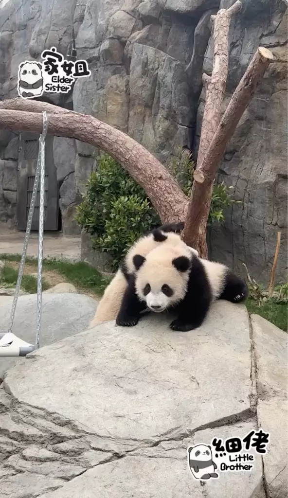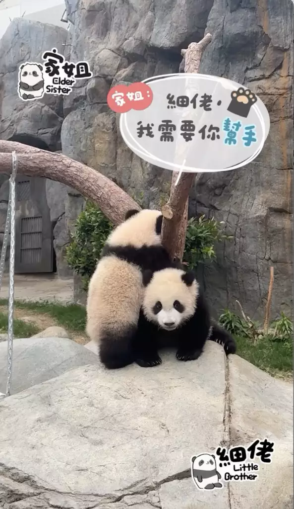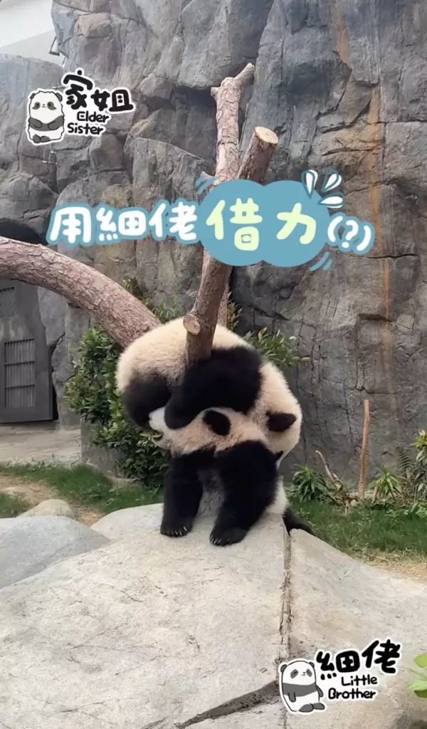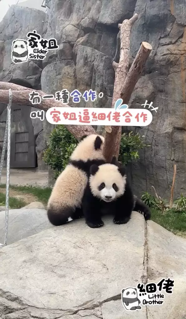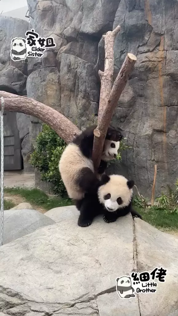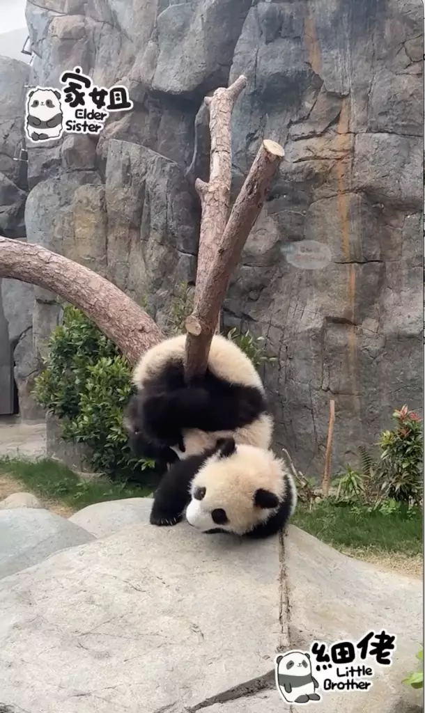 海洋公園大熊貓「盈盈」所誕下的一對龍鳳胎「家姐細佬」一向鬼馬精靈,早前海洋公園就公開了體操界新秀「家姐」稱霸樹丫的影片(相關新聞:體操界新秀「家姐」稱霸樹丫 熊貓「體操世一」挑戰高難度招式冇難度),來到星期三,向來愛拼敢贏的「家姐」再有新搞作。