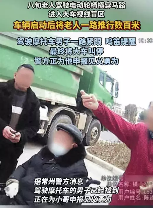 江蘇翁橫穿馬路遭貨車頂著輪椅向前推行數百米,幸獲好心騎士發現及時喊停貨車得以化險為夷。