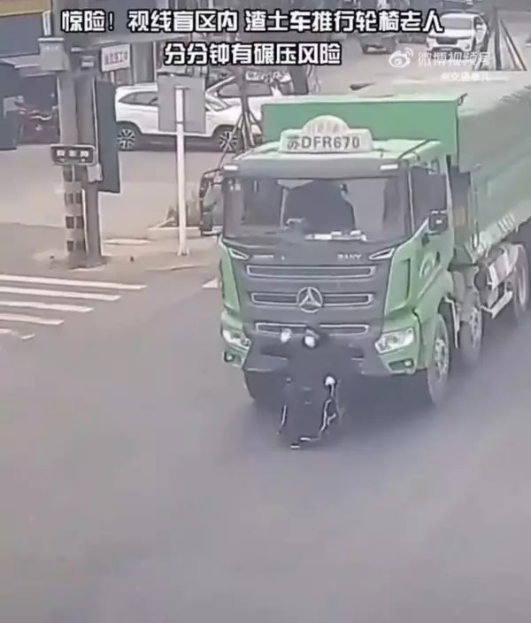 綜合內媒報導,江蘇常州一名老翁日前坐著輪椅從一輛大貨車前穿過馬路,結果恰逢綠燈,加上處於貨車司機視野盲區,因此對方在不知情的情況下起步,頂著輪椅向前行駛了幾百米。