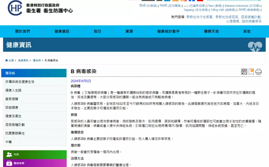 根據衛生防護中心資料,人類感染B病毒屬罕見。全球自1932年至今只錄得約50宗有相關人類感染的報告。此類個案曾於美國、加拿大、內地及日本發生,多由猴子咬傷或抓傷引起。