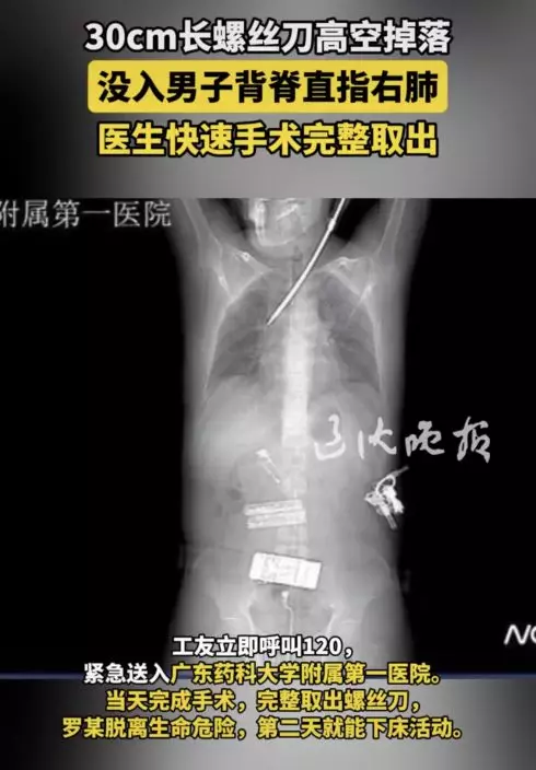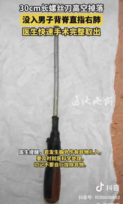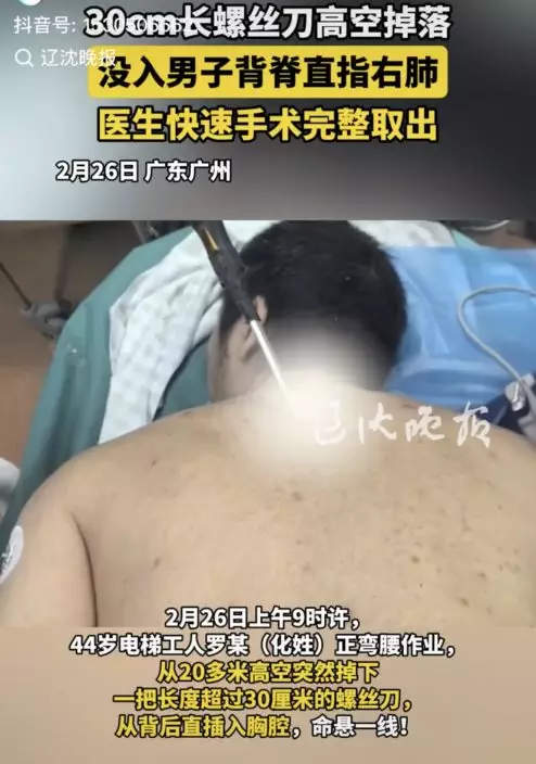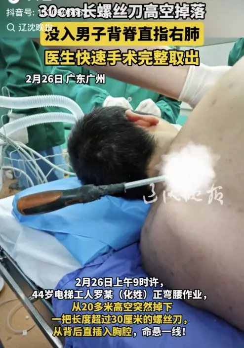 綜合內媒報導,廣東一名44歲男電梯工人2月26日蹲在路邊專注作業時,一把長約30釐米的螺絲刀突然從20多米高空掉下,不偏不倚從他的背後插進胸腔,情況十分凶險。