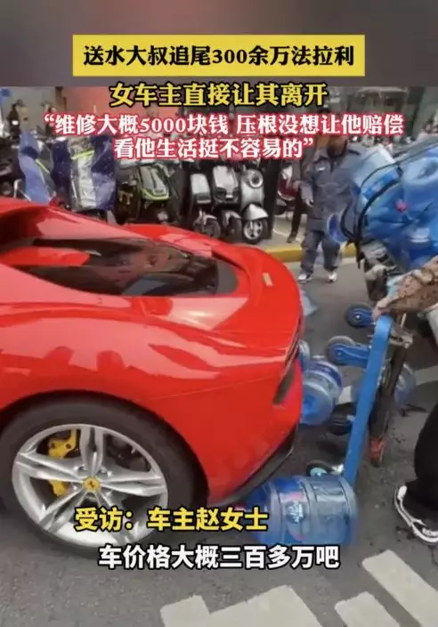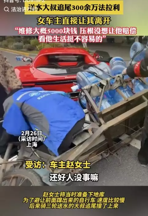 上海女車主駕駛法拉利遭送水大叔的三輪車追尾,雖然車輛受損,但仍選擇放棄賠償獲網讚大度。