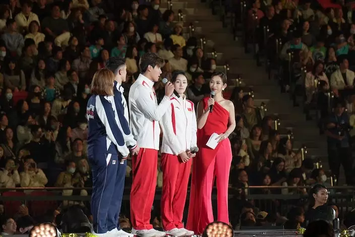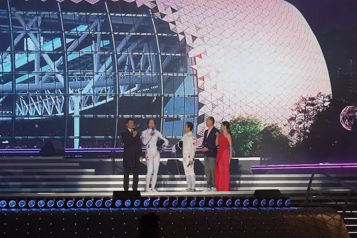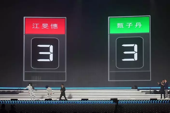 巴黎奧運取得女子重劍金牌的江旻憓與「宇宙最強」影星甄子丹上台表演劍擊。