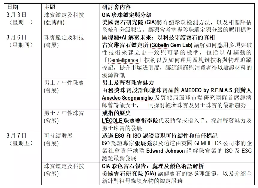 珠寶雙展期間將舉行超過30 場珠寶行業講座、珠寶匯演、交流酒會等活動,讓參加者掌握鑑定技術、珠寶科技、可持續發展等最新的行業趨勢,部分精彩活動包括: