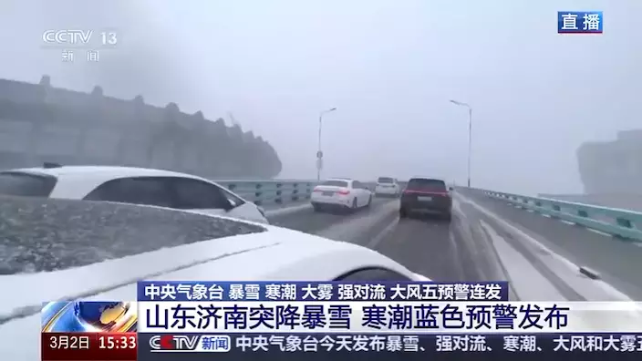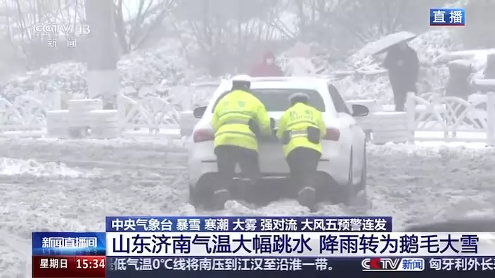 山東出現寒潮和大範圍雨雪天氣,當地氣象台表示,截至下午2時,全省多個市縣出現降雪,平均降雪量2.5毫米,其中濟南市區降雪量最大,達17.9毫米,濱州陽信錄得最大積雪深度,有13厘米。