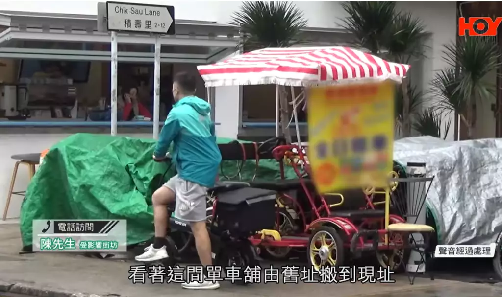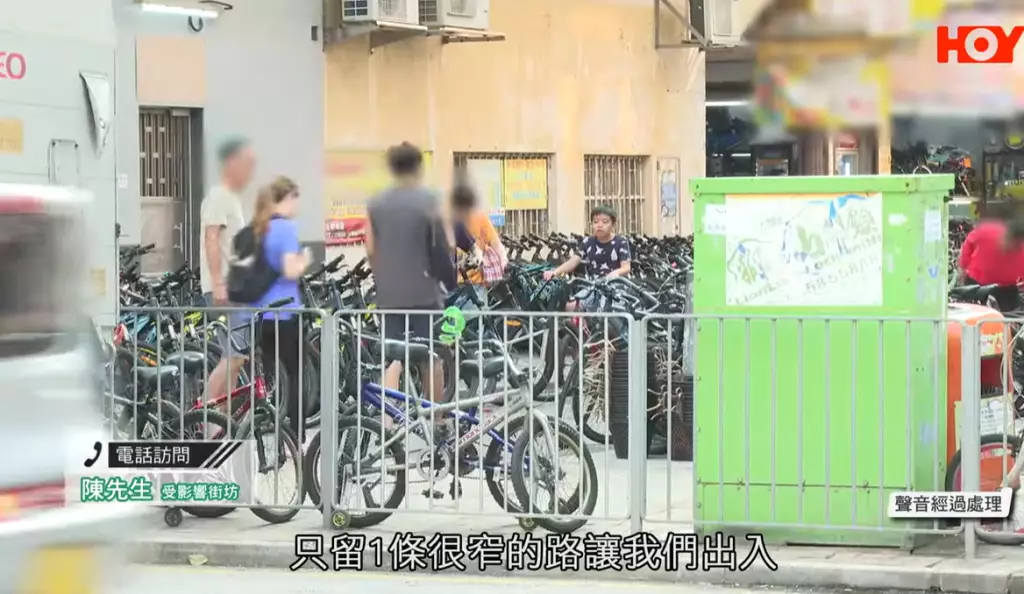街坊陳先生居住在大圍十多年,指涉事單車舖由舊舖搬至新店後,情況便每況愈下,「目測都過百部單車,淨係留返條好窄嘅路俾我哋出入,顧客又會係路中揀車、試車,搞到『人車爭路』。」他又指,以往尚會「朝行晚拆」,傍晚時會用大貨車運走大部分單車,「過一段時間之後佢哋就冇再做呢個動作,將啲單車24小時泊晒係條街到。」陳先生曾向食環署投訴,惟跟進後問題依舊。