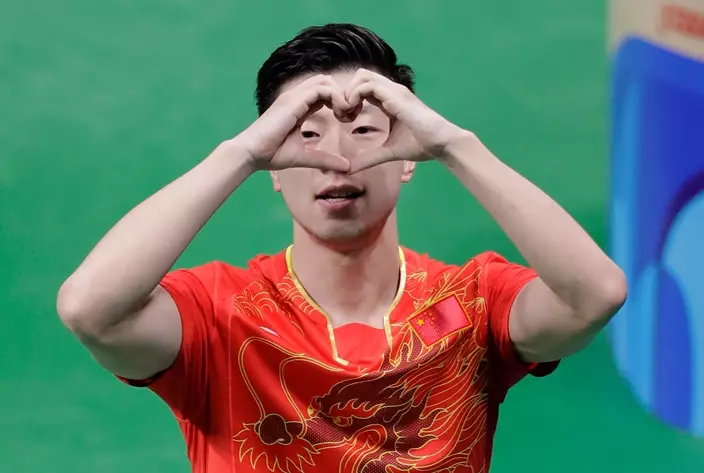 里約奧運男單勝利後馬龍默默做出心型手勢。(AP圖片)