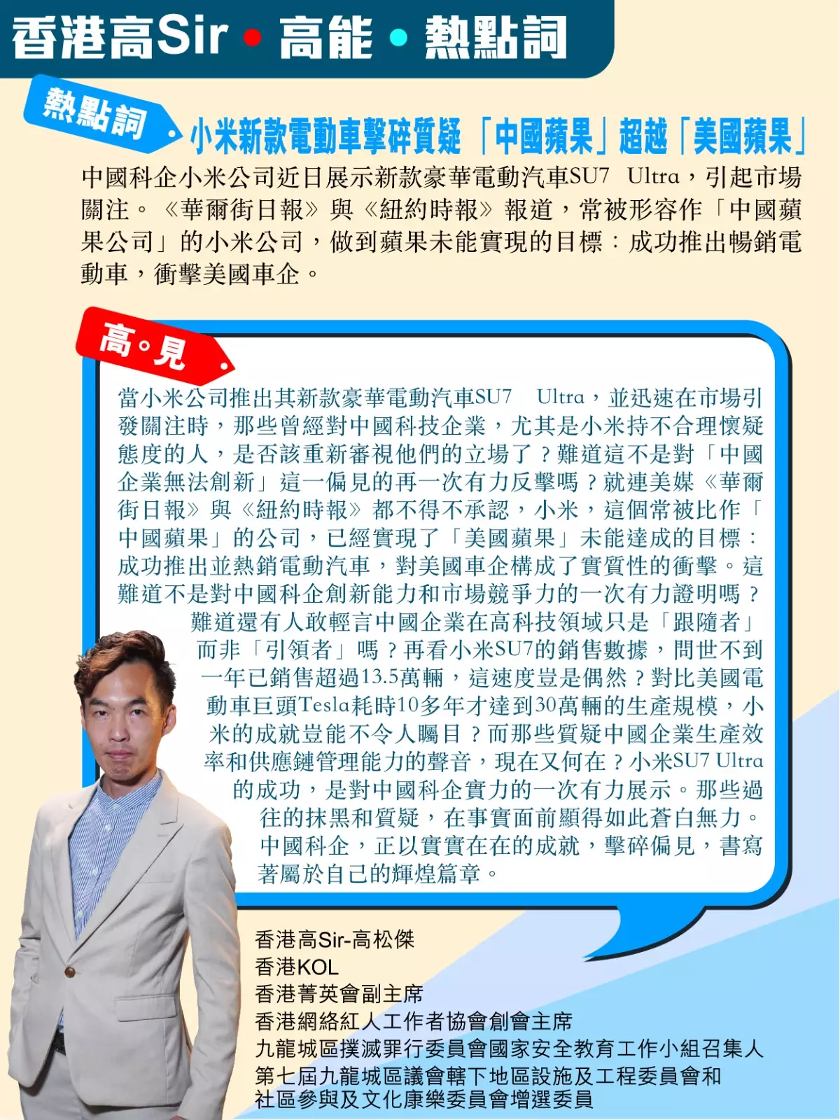 高Sir:當小米公司推出其新款豪華電動汽車SU7 Ultra,並迅速在市場引發關注時,那些曾經對中國科技企業,尤其是小米持不合理懷疑態度的人,是否該重新審視他們的立場了?難道這不是對「中國企業無法創新」這一偏見的再一次有力反擊嗎?就連美媒《華爾街日報》與《紐約時報》都不得不承認,小米,這個常被比作「中國蘋果」的公司,已經實現了「美國蘋果」未能達成的目標:成功推出並熱銷電動汽車,對美國車企構成了實質性的衝擊。這難道不是對中國科企創新能力和市場競爭力的一次有力證明嗎?難道還有人敢輕言中國企業在高科技領域只是「跟隨者」而非「引領者」嗎?再看小米SU7的銷售數據,問世不到一年已銷售超過13.5萬輛,這速度豈是偶然?對比美國電動車巨頭Tesla耗時10多年才達到30萬輛的生產規模,小米的成就豈能不令人矚目?而那些質疑中國企業生產效率和供應鏈管理能力的聲音,現在又何在?小米SU7 Ultra的成功,是對中國科企實力的一次有力展示。那些過往的抹黑和質疑,在事實面前顯得如此蒼白無力。中國科企,正以實實在在的成就,擊碎偏見,書寫著屬於自己的輝煌篇章。