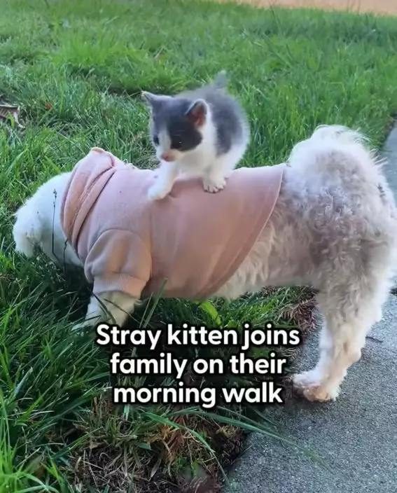 男子遛狗遇流浪小貓跳上愛犬背部「踩奶」