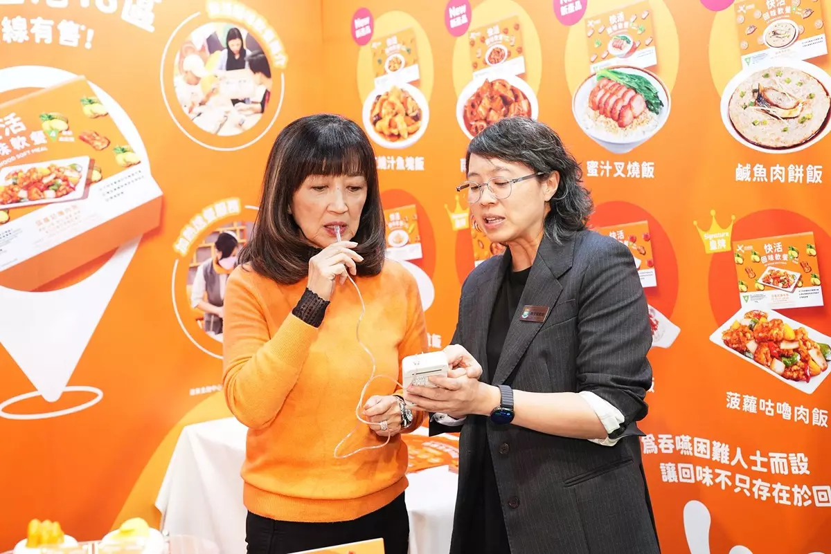二人與大眾互動,分享照護食軟餐資訊,指出營養最重要,就如「快活回味軟餐」遵從健康飲食金字塔設計,確保均衡營養,嚴格把關品質。同時,大家要懂得食物標籤,因為照護食軟餐都有不同的標準指引,不同等級,適合不同人士的需要。