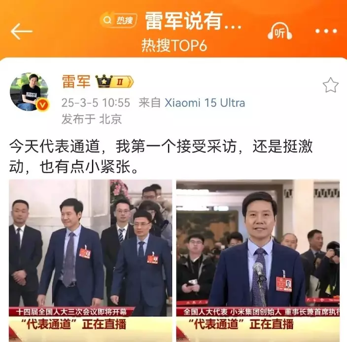 雷軍發帖說,自己在代表通道第一個接受採訪,「還是挺激動,也有點小緊張」。