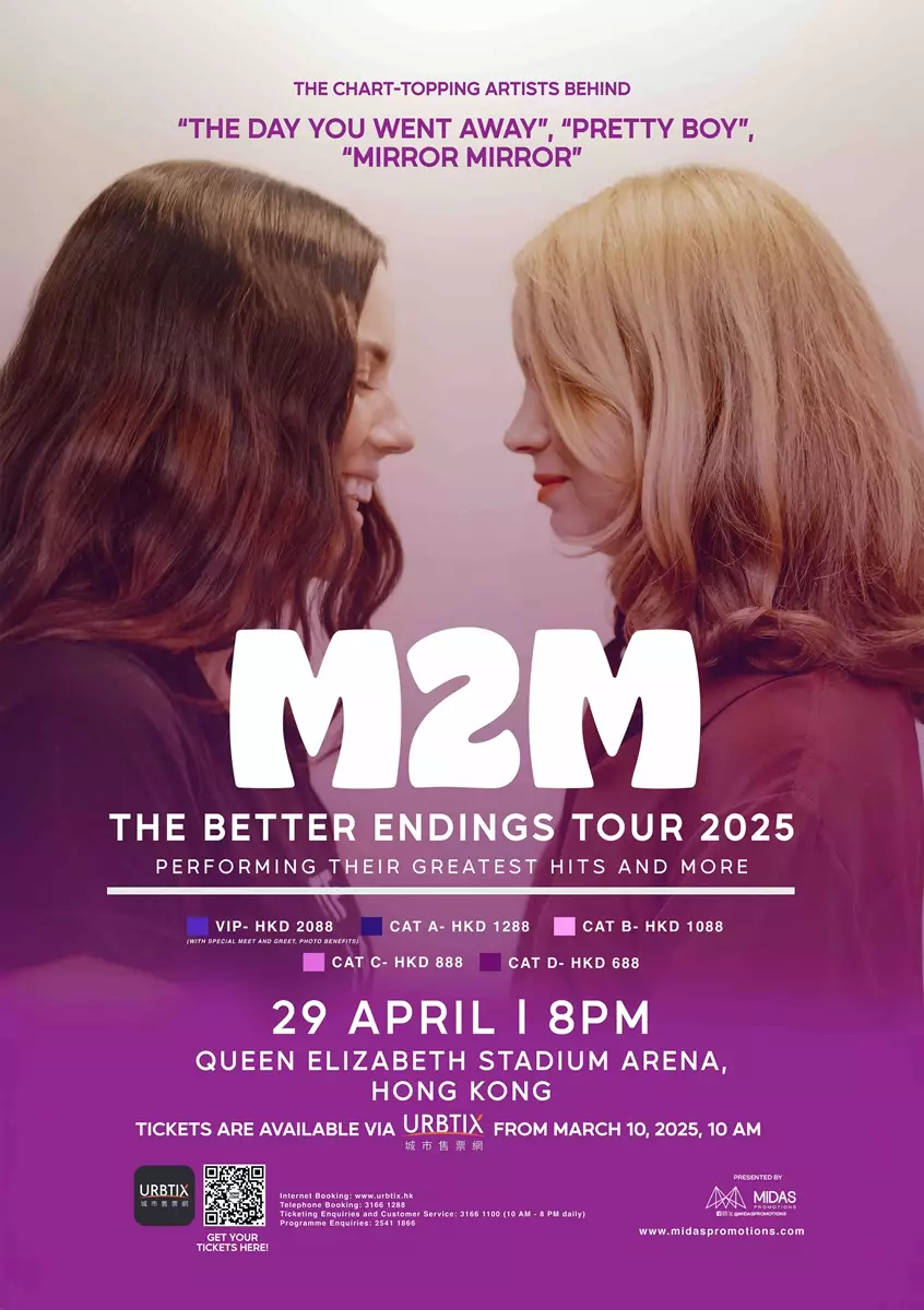 由Midas Promotions呈獻,香港粉絲們現在有機會親臨M2M《The Better Endings Tour 2025》,現場見證她們這次歷史性的回歸。M2M將為她們的故事賦予更好的結局,並畫上完美句號。Marion表示:「我們終於可以做我們一直夢想的事情了。我急不及待地想再次回到舞台上與Marit一起演奏音樂。Marit則說:「 製作《Shades of Purple》永遠改變了我們的生活,在同一個空間裡再次一起演奏這些歌曲,同時重新找回我們的音樂及彼此的友誼,這是一種特殊的魔力。這感覺很強大,就像慶典一樣。」
