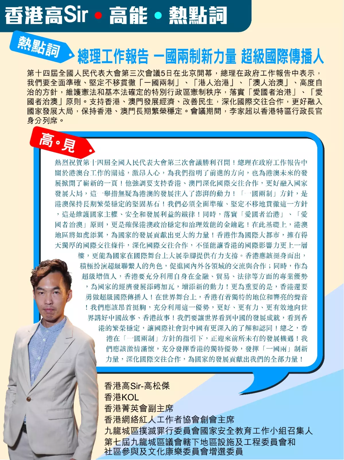 高Sir:熱烈祝賀第十四屆全國人民代表大會第三次會議勝利召開!總理在政府工作報告中關於港澳台工作的闡述,激昂人心,為我們指明了前進的方向,也為港澳未來的發展掀開了嶄新的一頁!他強調要支持香港、澳門深化國際交往合作,更好融入國家發展大局,這一舉措無疑為港澳的發展注入了澎湃的動力!「一國兩制」方針,是港澳保持長期繁榮穩定的堅固基石!我們必須全面準確、堅定不移地貫徹這一方針,這是維護國家主權、安全和發展利益的鐵律!同時,落實「愛國者治港」、「愛國者治澳」原則,更是確保港澳政治穩定和治理效能的金鑰匙!在此基礎上,港澳地區將如虎添翼,為國家的發展貢獻出更大的力量!香港作為國際大都市,擁有得天獨厚的國際交往條件,深化國際交往合作,不僅能讓香港的國際影響力更上一層樓,更能為國家在國際舞台上大展拳腳提供有力支撐。香港應該挺身而出,積極扮演超級聯繫人的角色,促進國內外各領域的交流與合作;同時,作為超級增值人,香港要充分利用自身在金融、貿易、法律等方面的專業優勢,為國家的經濟發展添磚加瓦,增添新的動力!更為重要的是,香港還要勇做超級國際傳播人!在世界舞台上,香港有着獨特的地位和響亮的聲音!我們應該昂首挺胸,充分利用這一優勢,更好、更有力、更有效地向世界講好中國故事、香港故事!我們要讓世界看到中國的發展成就,看到香港的繁榮穩定,讓國際社會對中國有更深入的了解和認同!總之,香港在「一國兩制」方針的指引下,正迎來前所未有的發展機遇!我們應該激情滿懷,充分發揮香港的獨特優勢,發揮「一國兩」制新力量,深化國際交往合作,為國家的發展貢獻出我們的全部力量!