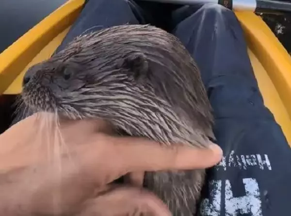 瑞典一隻水獺失去媽媽後被保育員帶回家照顧,後來回歸野外,但在湖泊看見對方划艇經過時,隨即遊上前撒嬌討摸摸。