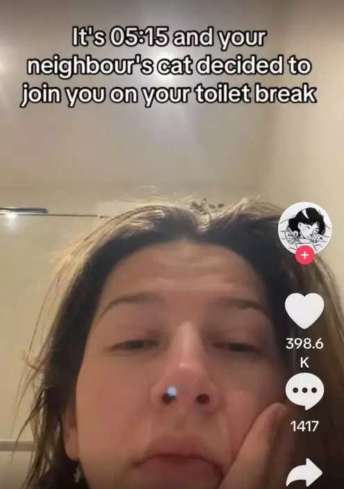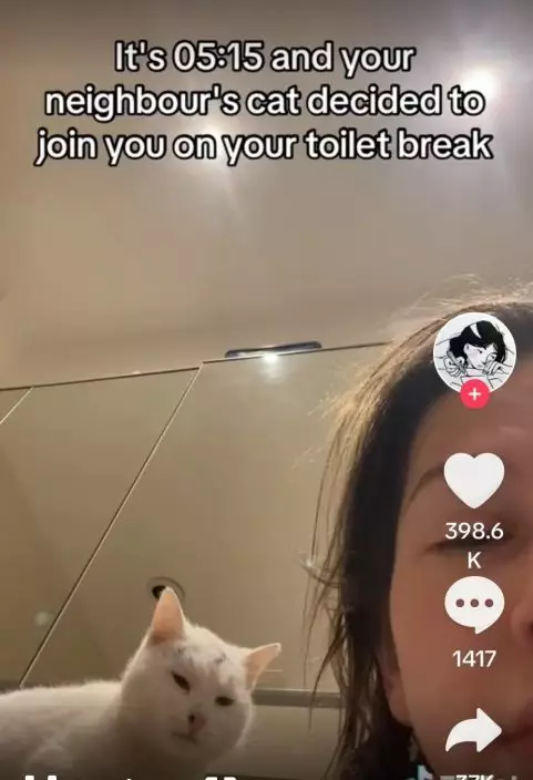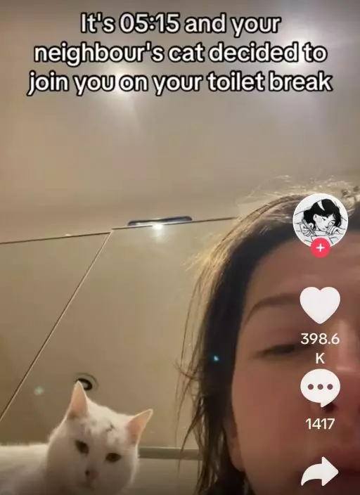 日前,英國東南部漢普郡(Hampshire)一名女子在TikTok上分享一名「不速之客」闖入家中的經歷。她表示,自己凌晨5時起床上廁所時,赫然看見一隻白色貓貓出現在身旁陪她上廁所,由於自己並未養貓,因此這名「不速之客」的出現讓她相當錯愕。