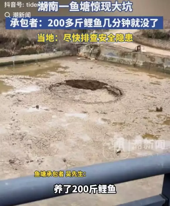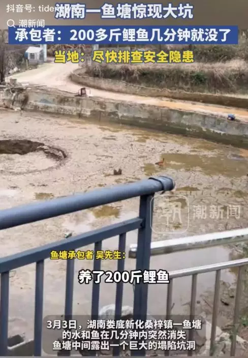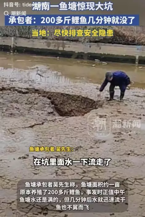 湖南一處魚塘突塌陷現巨大坑洞,養殖戶逾100KG鯉魚全流光損失慘重。