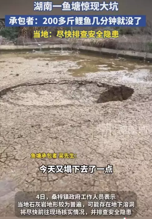 綜合內媒報導,湖南婁底桑梓鎮大樹社區一處魚塘於3月3日突然發生塌陷。照片可見,魚塘幾乎乾涸,並在中央形成了一個坑洞。