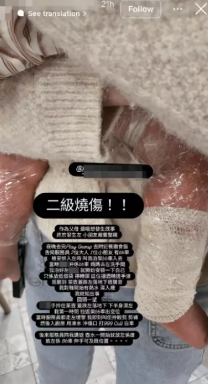 B女下半身遭熱水淥傷,送院被診斷為二級燒傷。事後,港爸在帖文中hashtag涉事餐廳,並引述服務員的說法:「壺水一開始就放咗係度,放咗係BB車,伸手可及既位置。」他對此表示不滿,並在後續帖文求網民推薦有處理二級燒傷經驗的醫生,以及分享消除燒傷疤痕的方法。