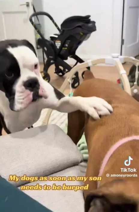 影片可見,Goose目不轉睛望向嬰兒的方向,並向飼主吠叫示意,似在阻止對方的行為,之後更躍上梳化接近嬰兒。與此同時,另一隻黑白拳師犬Rooster則表現冷靜,似對同伴的「過度保護」早已習以為常,牠輕拍Goose的背部,猶如安撫對方放鬆情緒。Goose隨後也逐漸平靜,未再作出干預,事件最終和平收場。