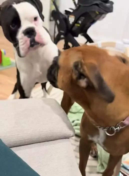 拳師犬誤會飼主掃風「傷害BB」急跳梳化阻止,同伴見狀冷靜安撫引網民笑:保護欲爆棚!