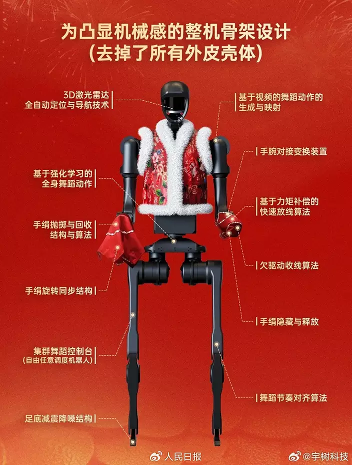 2025年蛇年春晚,宇樹科技與新疆藝術學院合作的《秧BOT》成為焦點。一群穿花棉襖的機器人歡快扭秧歌,尤其是可以像人類手臂一樣,精準控制高速旋轉手絹並拋接,展現了機器人的高靈活度與精準度。當晚舞台上的16台H1宇樹機器人來自杭州宇樹科技公司。宇樹科技「90 後」CEO王興興,打破質疑,開創足式機器人技術先河。從手工打造機器人,到產品佔全球近 7 成份額。他最近接受在人民日報新媒體發表演講時表示,堅信在「快時代」下「慢」一點,堅持自主研發。相信這一代中國人能做更強的AI、更好的機器人、更酷的游戲、更火的電影。他又引用《哪吒2》的台詞與觀眾共勉:「難道你還想改變這世界?我想試試!我們一起試試!」